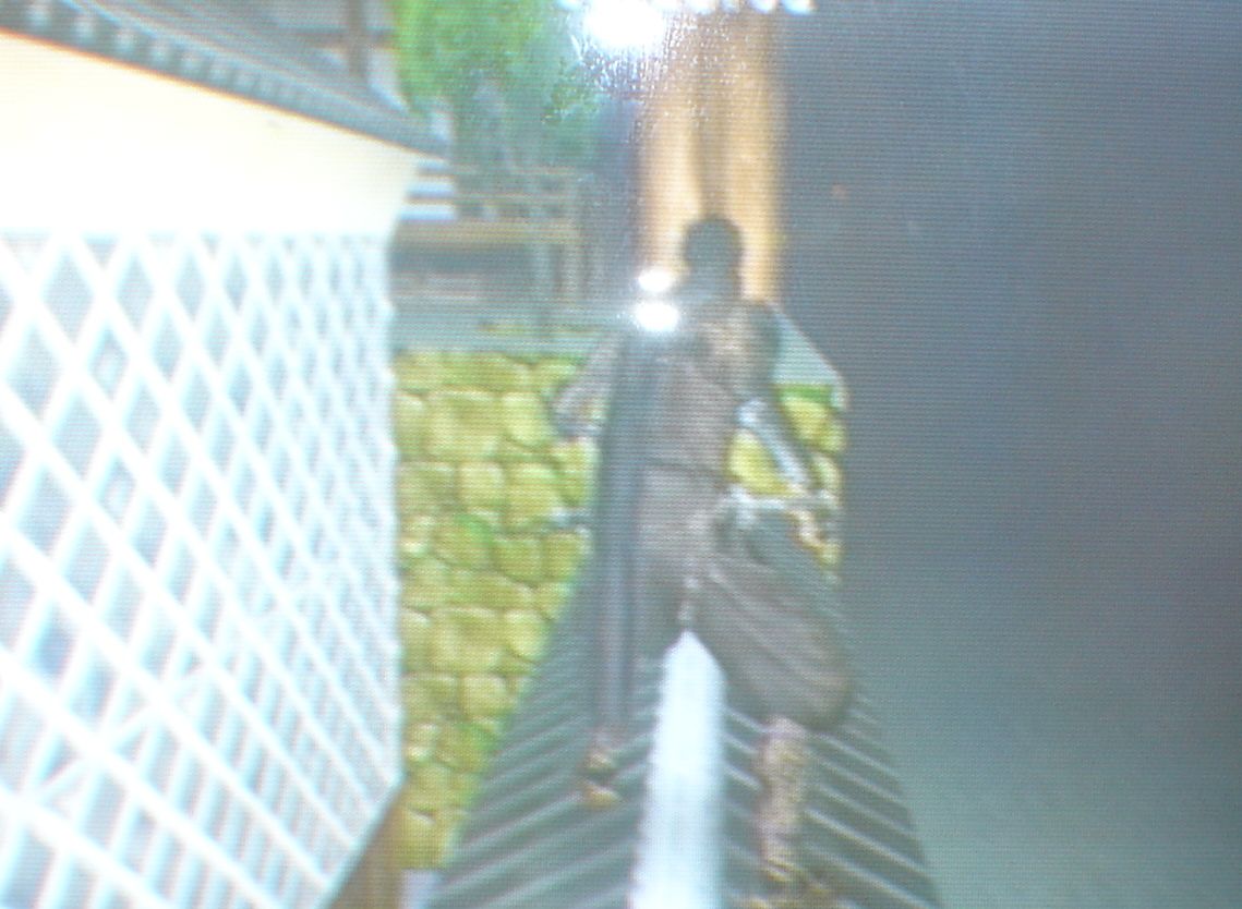 やぐらの脇の塀を通ったら、左の蔵の屋根に飛び移り、前方更に高い位置にある塀の上に飛び移る。
