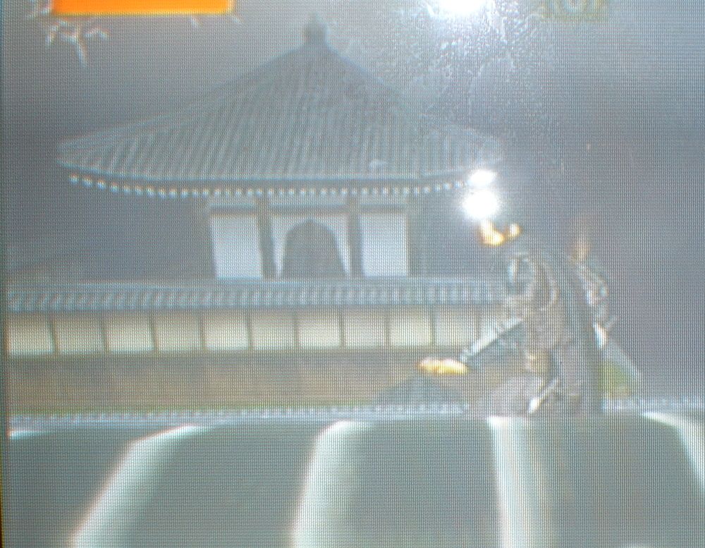 スタート地点、門前の武士を血祀し、鉤鎖とジャンプを用いて三段階にわたり上に昇ると上記塀の上に立つことが出来る。左に幽閉されし熊、右下にスタート地点となる。