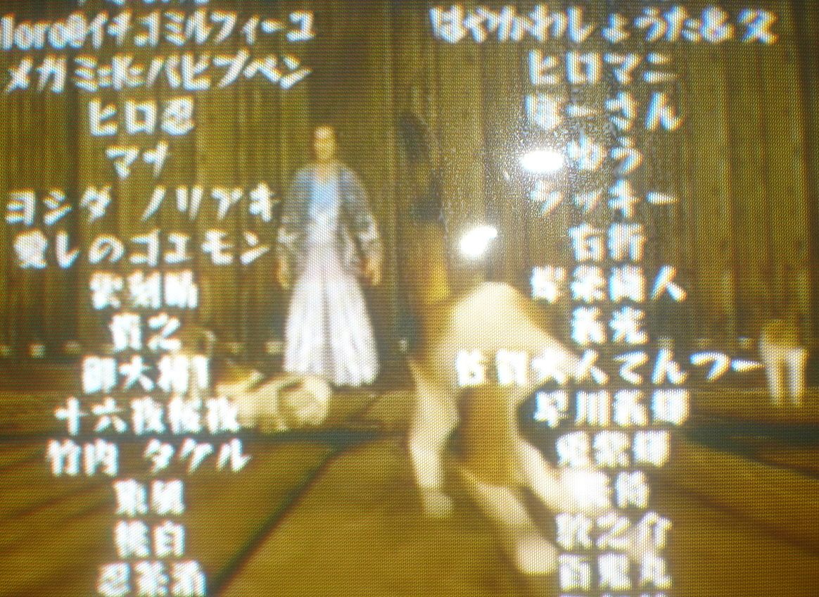 上記写真は、忍道匠・忍者之塔をクリアした時の特典映像の一部をデジカメで撮影したものです。いわゆるエンドロールと呼ばれる代物です。昔から映画を見た後、ゲームをクリアした後に自分の名前がエンドロールで流れたらトッテモ気持ちe~だろうなぁ~と思って、はや十数年。天誅忍百選の時応募に遅れ、涙を呑み屈折数年。今ようやく念願がかない次の目標に向かえそうです。次の目標は映画のエキストラか出資!まぁ、我ながら随分と大きくでたもんです。そういえば仲間由紀枝・オダギリジョー主演の「SHINOBI」でも一般投資家に出資を集ってた話がありましたよね。これまた乗り遅れたけど・・・トホホ